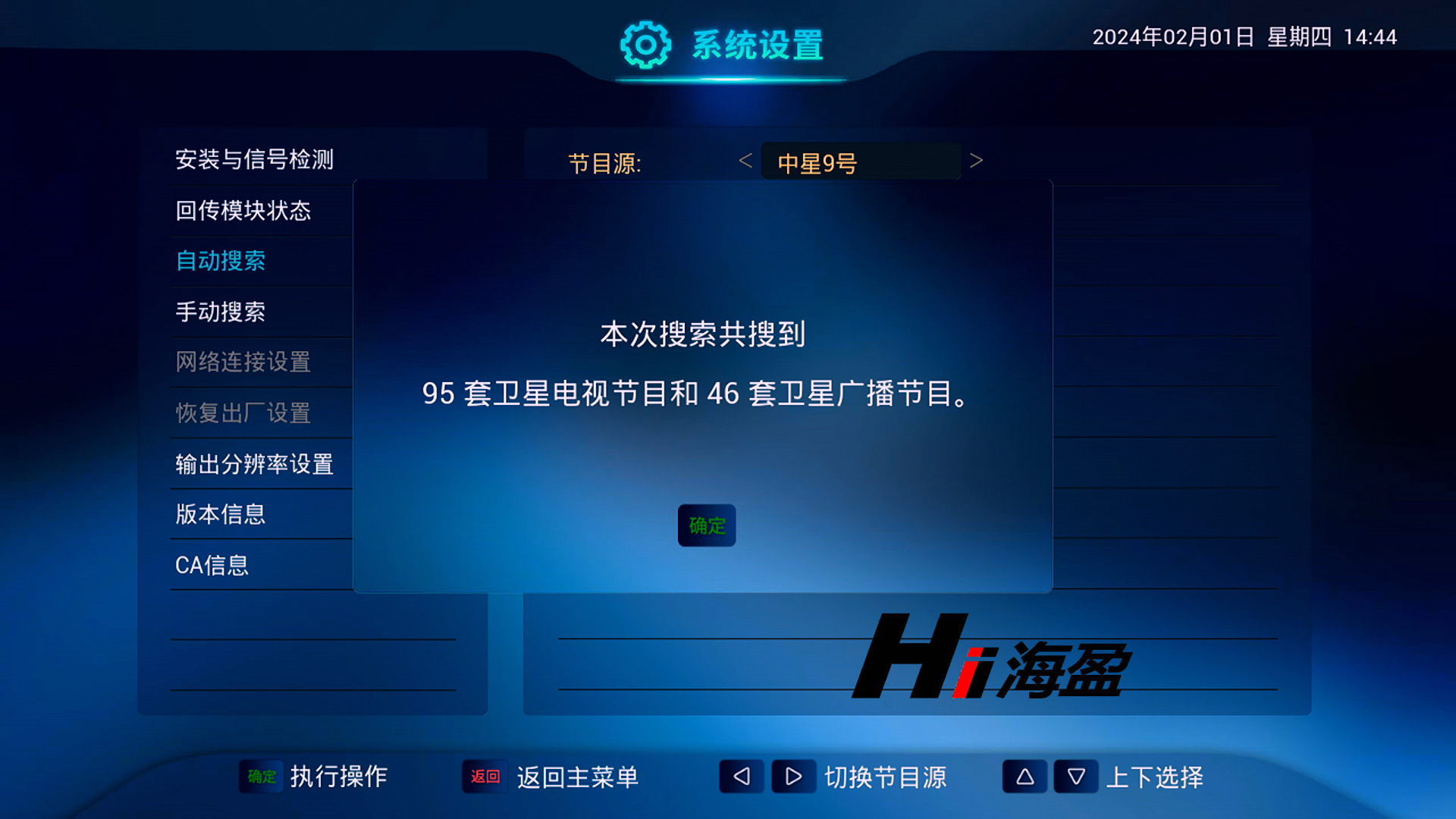 自動搜索后,顯示共搜到:“95 套衛(wèi)星電視節(jié)目和46套衛(wèi)星廣播節(jié)目”
